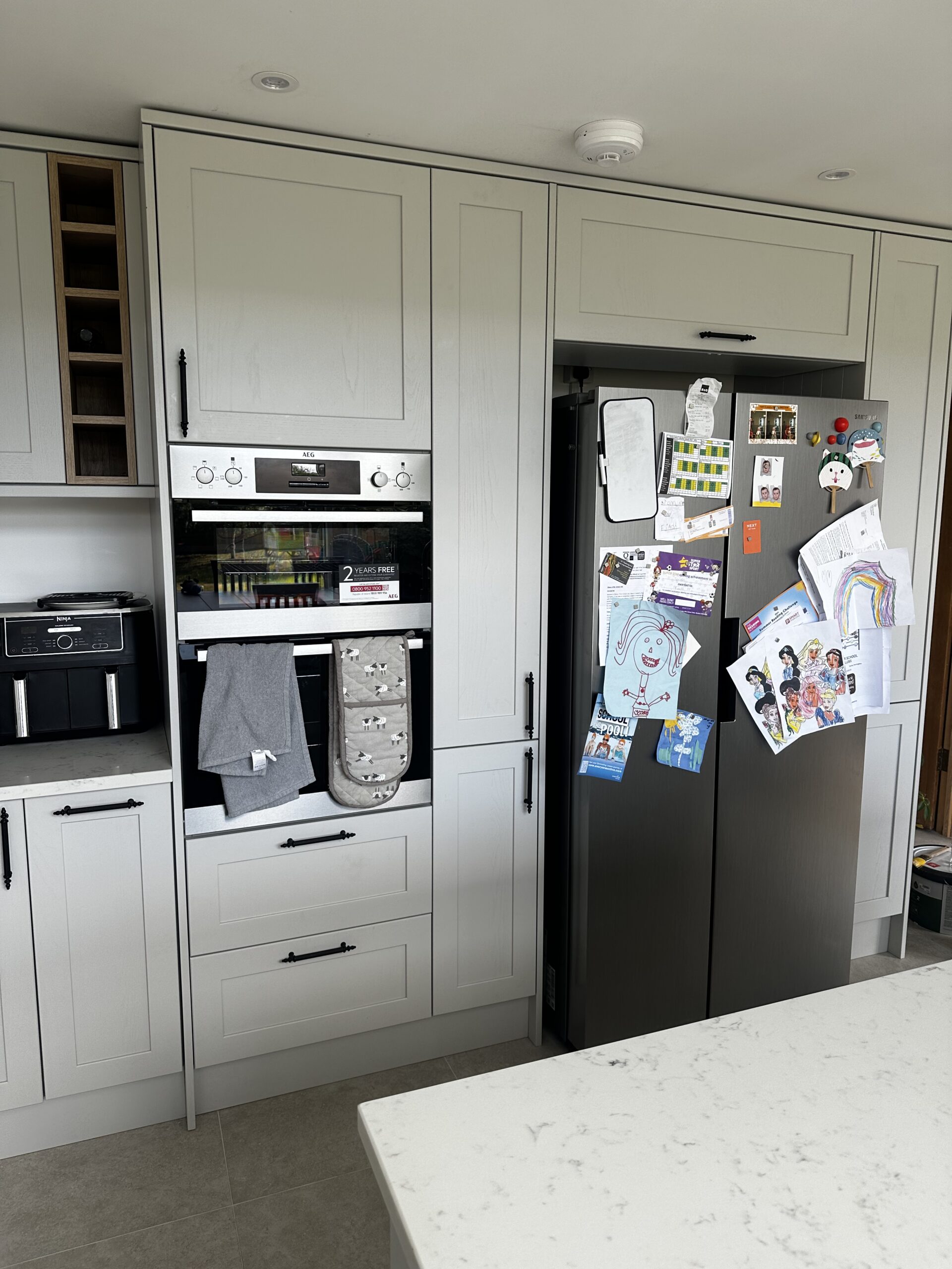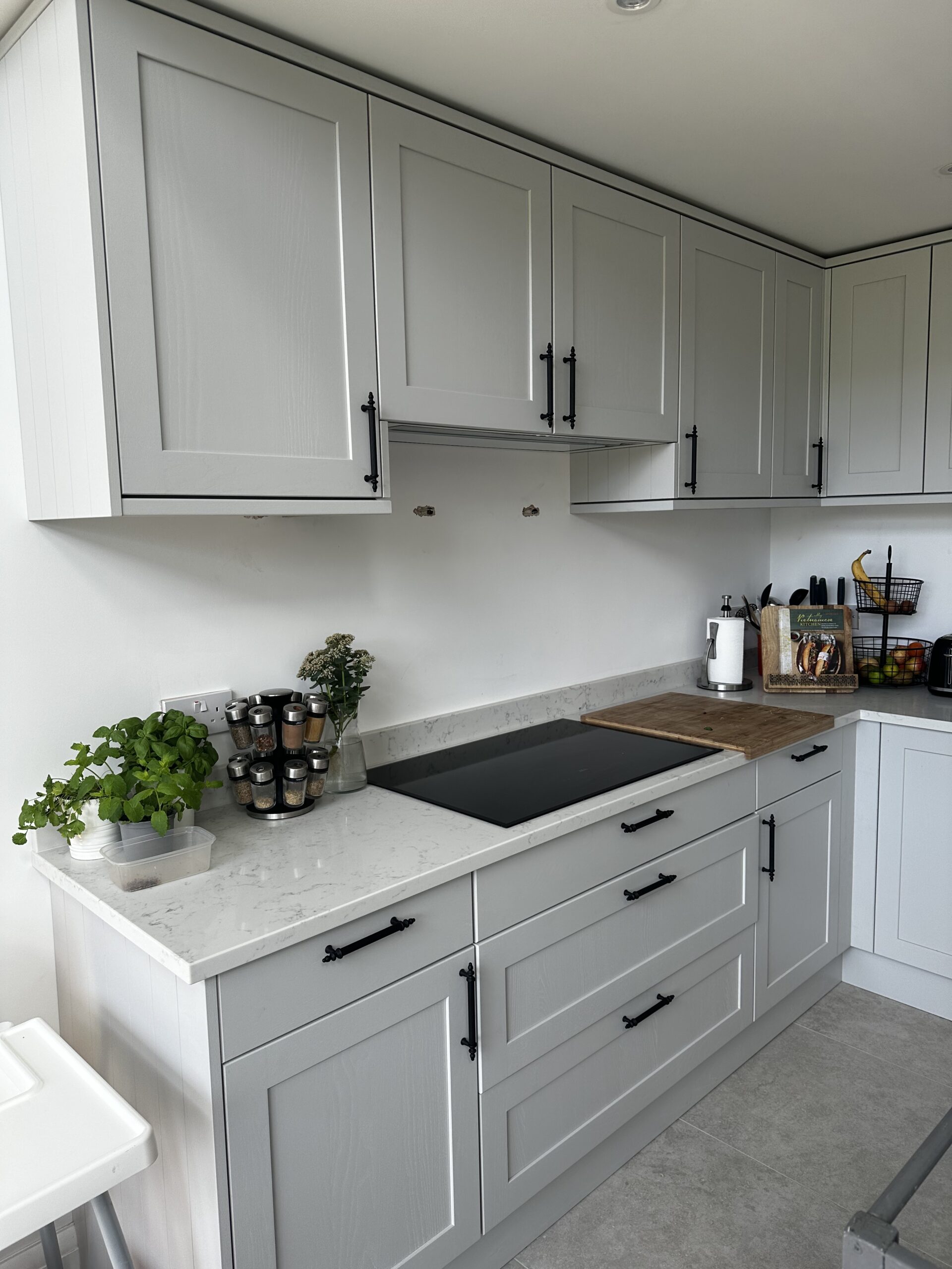 This stylish kitchen installation features classic shaker-style cabinetry in a soft grey finish, paired with sleek black hardware for a refined, modern look. At the heart of the space is a large central island topped with a polished quartz worktop, providing ample space for food prep, casual dining, and entertaining.