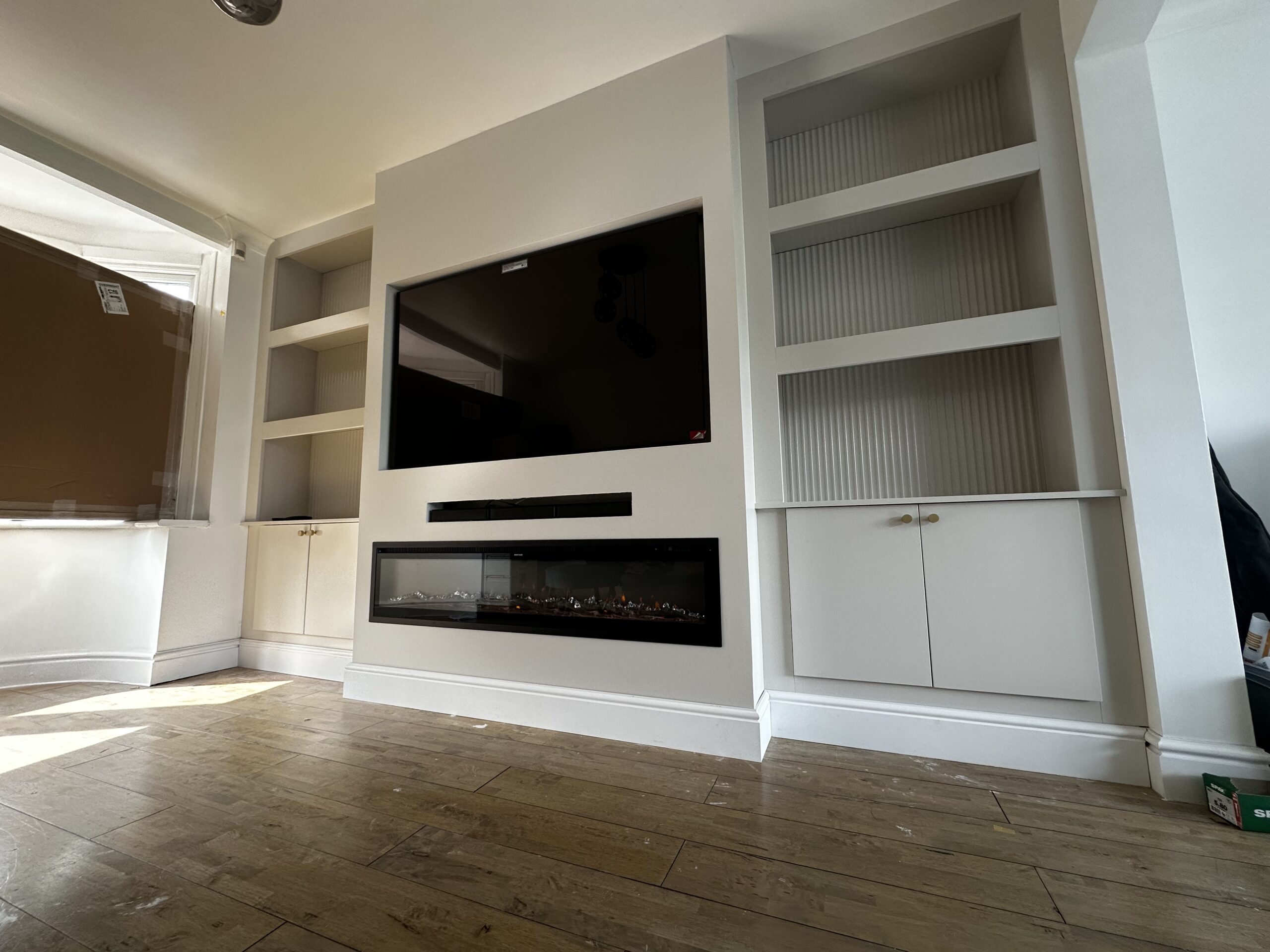 This elegant media wall was custom-designed and installed to provide a seamless focal point for the living space. It features a sleek, wall-mounted TV with a recessed electric fireplace below, creating both warmth and style. Flanking the center are bespoke shelving units with fluted backing panels and soft LED lighting to add texture and ambiance. Below, discreet built-in cabinetry offers practical storage while maintaining a clean, minimalist aesthetic. A perfect balance of function and design.